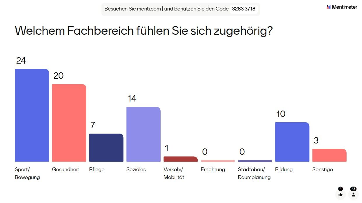 Zu Beginn des Netzwerktreffens gaben die Teilnehmenden mithilfe des Umfragetools Mentimeter an, welchem Fachbereich sie angehören. Somit wurde auch deutlich, aus welchem Blickwinkel sie das Thema der Veranstaltung betrachteten. Die meisten Teilnehmenden kamen aus den Bereichen Sport und Bewegung gefolgt von den Bereichen Gesundheit und Soziales.